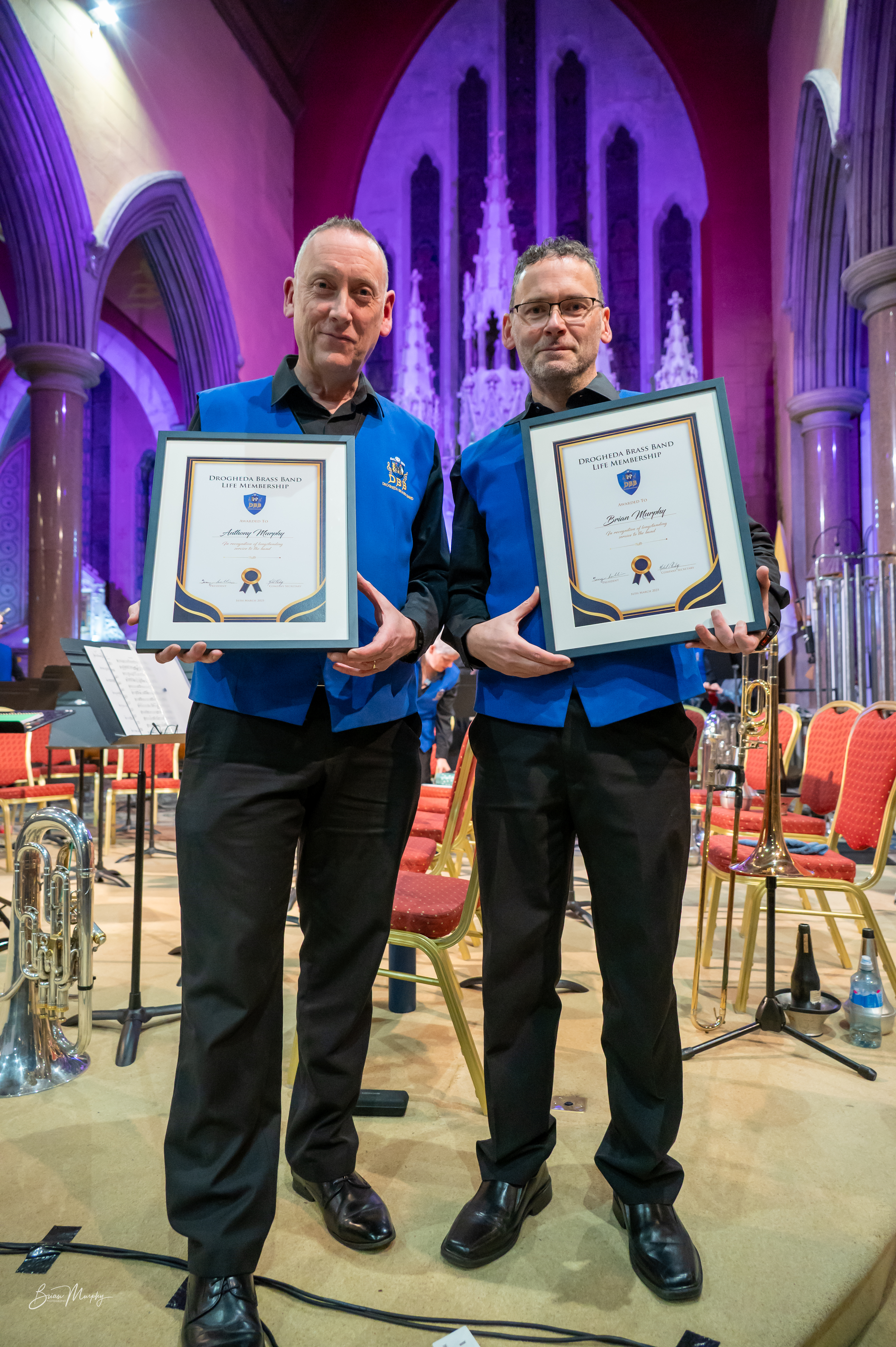 In a heartwarming segment of the evening, the band honored two of their longest-serving members, brothers Anthony Murphy and Brian Murphy, who were presented with Honorary Life Memberships. This gesture was a recognition of their unwavering dedication and significant contributions to the band over the years. The presentation was met with enthusiastic applause, as the audience celebrated the Murphys' legacy and commitment to the musical community.